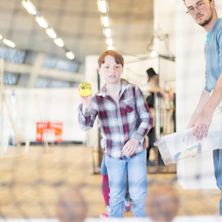 Coconut Complaints was a permanent attraction throughout the four days at Tate Exchange. The aim of the stall was to invite participants to shout out a political complaint, and in exchange the participant can choose a political tool from the available beanbags to then have a go at knocking a coconut off the stand. Six of the beanbags were used for Coconut Complaints, and the other six were used for the Trump clown performance (performed by the young people from Valleys Kids) (see photographs 11-14).